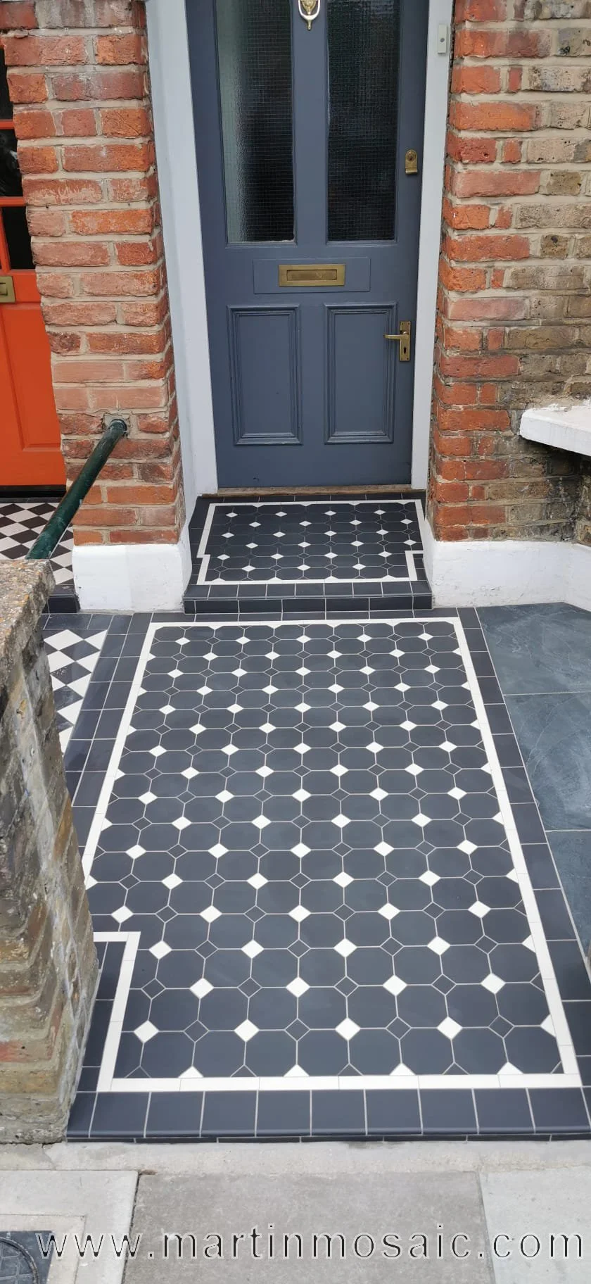 224 Victorian floor tiles - Entrance & Steps. Mosaic floor tiles with marble risers. Colours: white, black