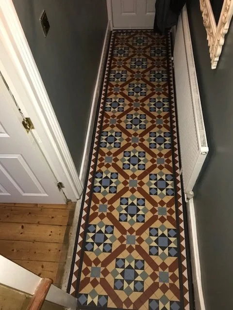 151 Victorian floor tiles - Hallway. Mosaic tiles thick 9mm.Colours: coffee, dark blue, red, ivory, black